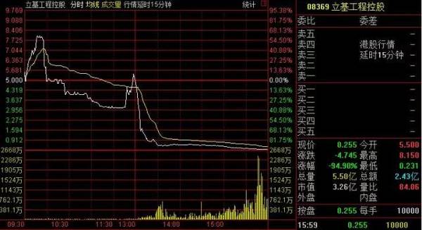 今日立基工程式控制股暴跌,截止收盤,報價0.255港元,跌94.9%,全天成交2.425億港元。
