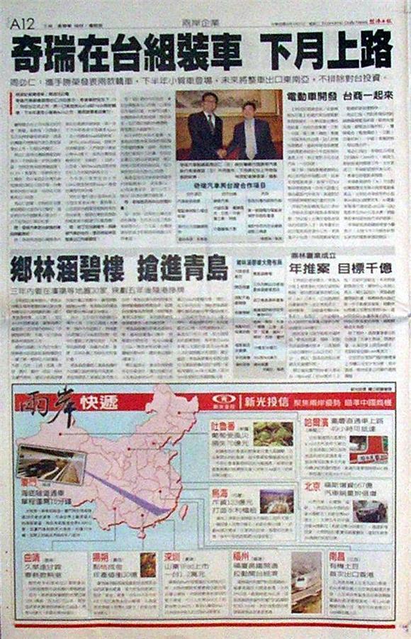 奇瑞汽車加速電動車開發腳步,大舉借重台灣技術能量,包括台塑集團、立凱、中碳、富士康(鴻海)集團、明基等知名台商,加入研發供應體系,協助奇瑞首款鋰電池純電動車能在今年底前順利量產上市,與主要對手比亞迪汽車,一別苗頭。