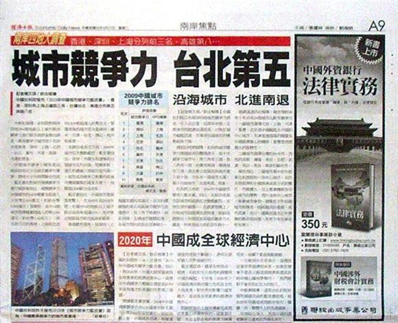 大陸中國社科院針對兩岸294個城市,依據政治、文化、經濟、環境等項目進行競爭力比較,2009年前10名的城市依次是香港、深圳、上海、北京、台北、廣州、天津、高雄、大連、青島。中國社科院城市與房產經濟研究室主任倪鵬飛表示,儘管港深滬位居前3名,但研究顯示,東南優勢略有下降,城市間差距縮小。