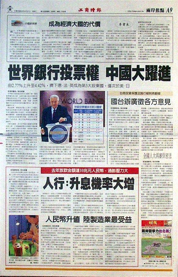 國際貨幣基金會(IMF)和世界銀行(World bank)一○年聯合春季會議廿五日於美國華府閉幕,會議通過投票權改革方案,將發展中國家在世銀投票權比例提高到四七.一九%,中國配得份額提升到四.四二%,成為世銀第三大股東,僅次美國和日本,比英、德、法還有發言權,反映世界政經版圖的變化。