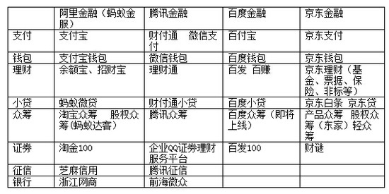 在支付的基礎上,BAT以及京東已疊加了融資、投資等多種品和服務。經濟觀察網記者根據公開資料不完全統計,目前4家互聯網巨頭已在支付、錢包、理財、小貸、籌、證券,以及征信、銀行等領域完成了初步佈局。