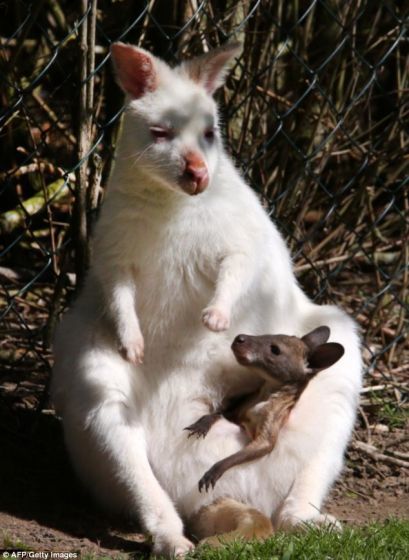 母袋鼠“阿爾伯塔”長一身雪白色的毛髮和粉紅色的耳朵,一直就是馬洛動物園的明星居民。升級做媽媽后,隻白化袋鼠更是集萬千寵愛於一身。“阿爾伯塔”生下的是一隻黑色小袋鼠,樣子非常可愛。現在,小傢伙舒舒服服地呆在媽媽的育兒袋裏,享受媽媽溫暖的氣息。